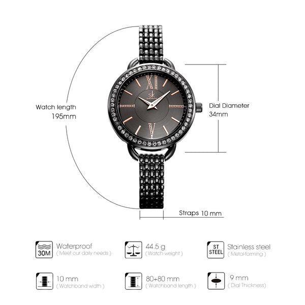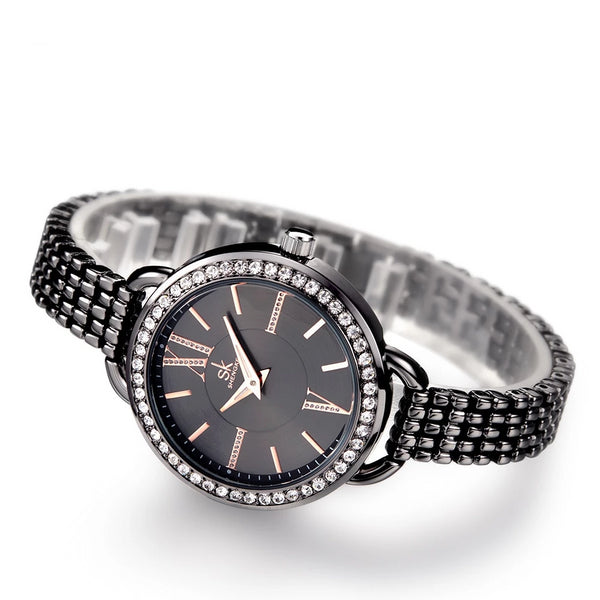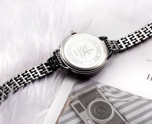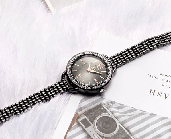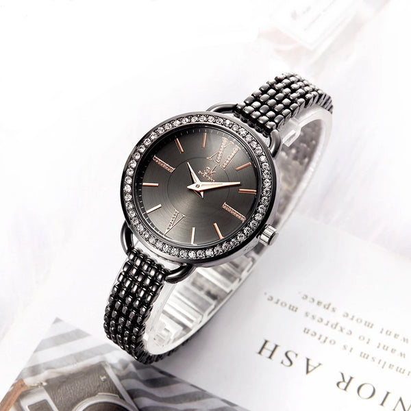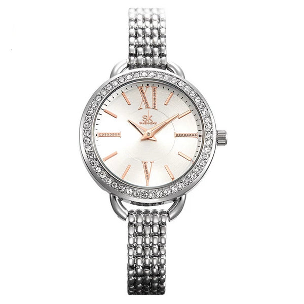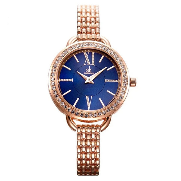 Metallic leaf adds stunning shimmer to the dial of a pristine round watch fitted with an elegant bracelet strap.
